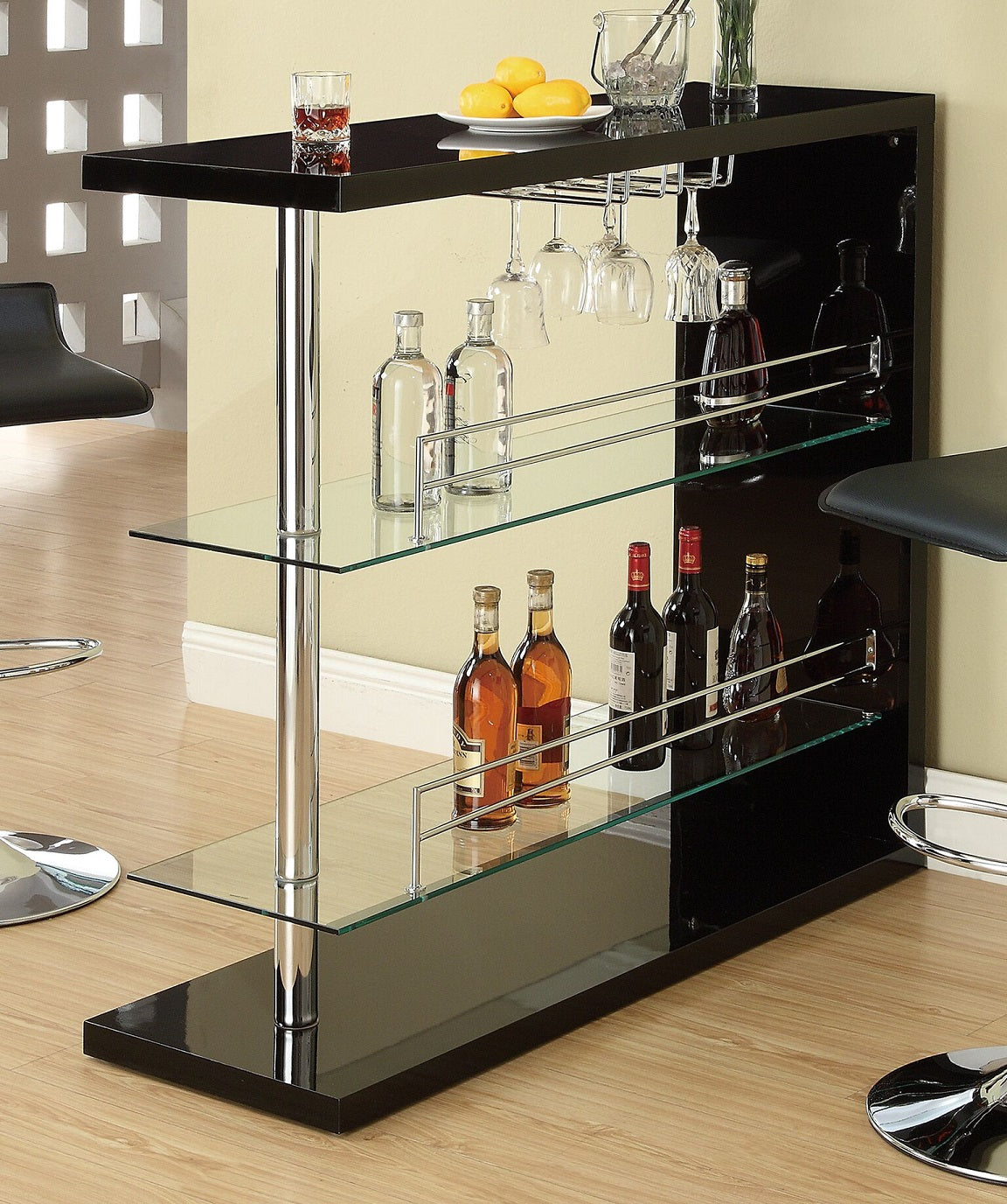 If you love to entertain, you'll love the charm and convenience of this fabulous, contemporary bar unit. With a sleek, stylish design, it looks elegant in a dining area or recreation room. Complete with a gorgeous gloss black finish and shining chrome accents, its bold silhouette makes a striking statement. This handsome unit includes two glass storage shelves for wine, glassware, and bar accessories. A handy wine glass holder rounds out its versatile appeal.