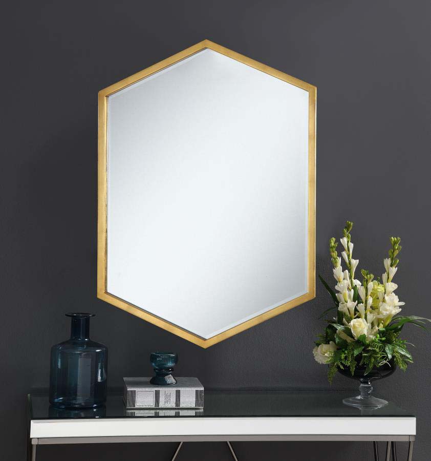 Add modern charm and elegance with this geometric wall mirror featuring a striking hexagon silhouette. The clear mirror surface is framed in a slim, metallic gold border that brings a touch of luxury to any space. Ideal above an entry console or bedroom dresser, this mirror combines function with refined decorative appeal.