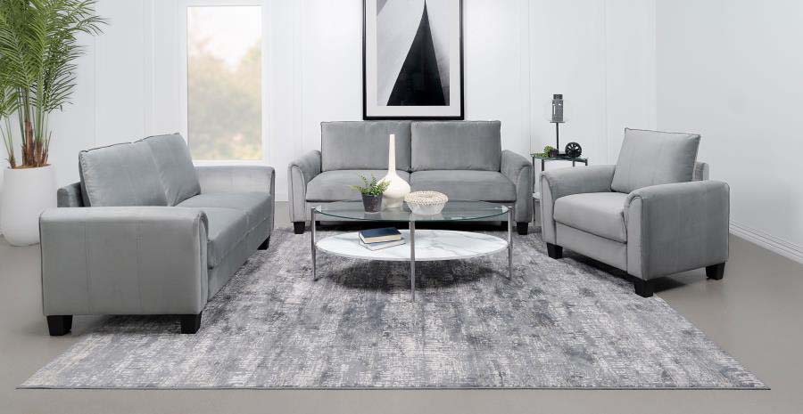 A perfect blend of comfort and sophistication, this three-piece modern sofa set is a chic centerpiece for your living room. It boasts a sofa, loveseat and armchair, each with velvety soft gray upholstery that creates a sleek but inviting ambiance. Back cushions feature vertical accent stitching and are reversible for added versatility. Rounded arms and block feet deliver a structured silhouette, creating a sense of gravitas in any sitting area. Cushions are supported with sinuous spring decking and webbed backing, ensuring optimal support for everything from lounging to entertaining.