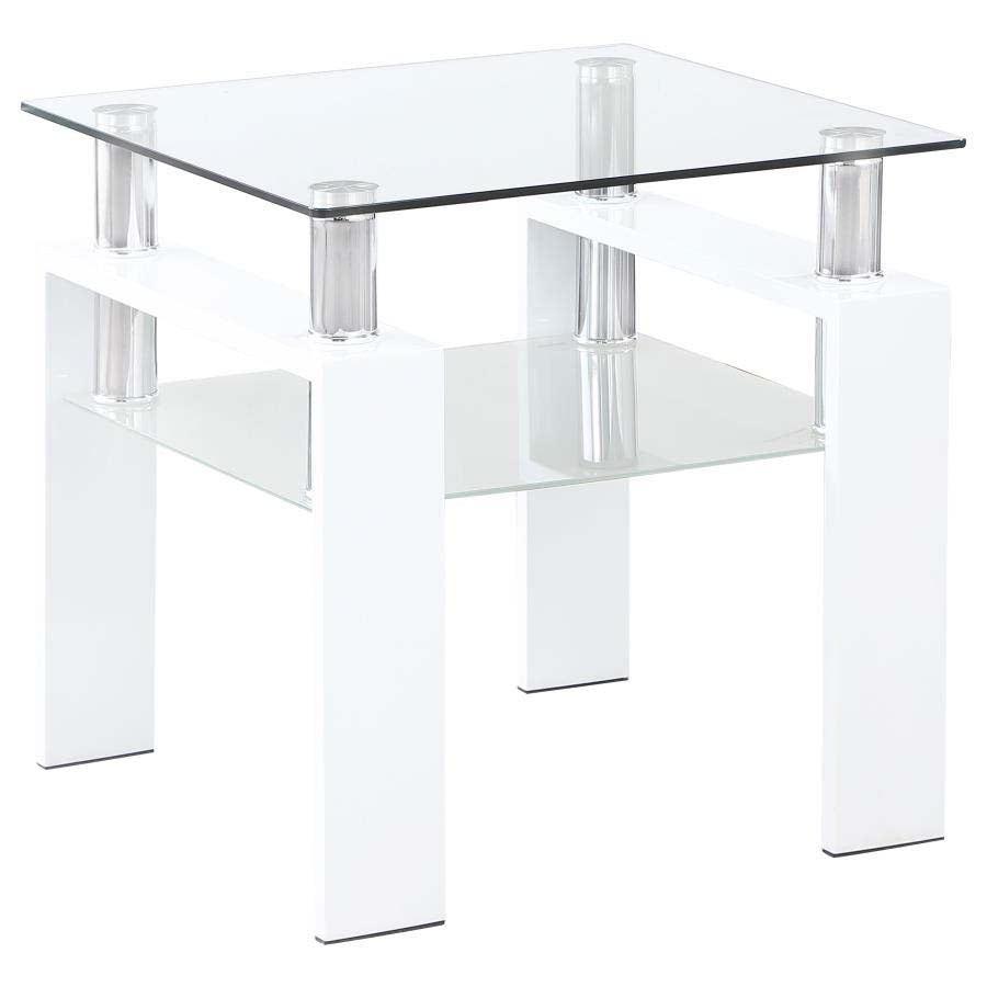 Enhance your interiors with our cutting-edge end table. Meticulously crafted, it presents a harmonious mix of materials and finishes: clear tempered glass tops juxtaposed with frosted shelves, all anchored by glossy white metal legs, accented by chrome-finished cylinders. This table effortlessly captures the essence of contemporary design, offering an unparalleled edgy charm that stands out in any setting.