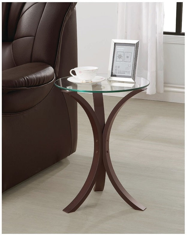 Smooth curves make this modern snack table versatile and stunning. Add instant elevation with the rounded and tempered glass table top. Delicate legs in a deep cappuccino finish transform spaces with ease. Open and airy, the light top looks great with a variety of motifs. Warm up a living room with the classic hues and contemporary silhouette.