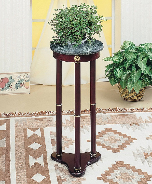 Accents to your house or townhouse add subtle touches that make it a home. This three-legged accent table gives your home character. It features a round green marble top that guests will stop and admire. Table is perfect as a stand for a small lily or your favorite scented candle. Comes finished in merlot with a soft, three-pronged spinner-like base.