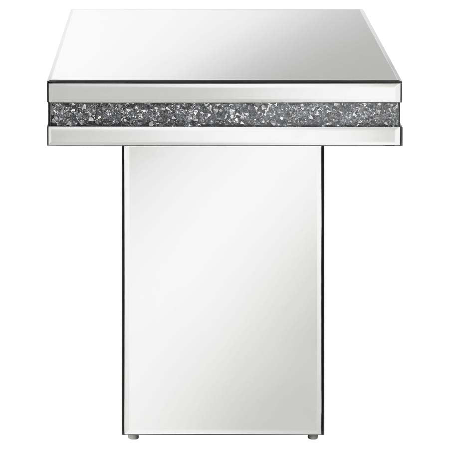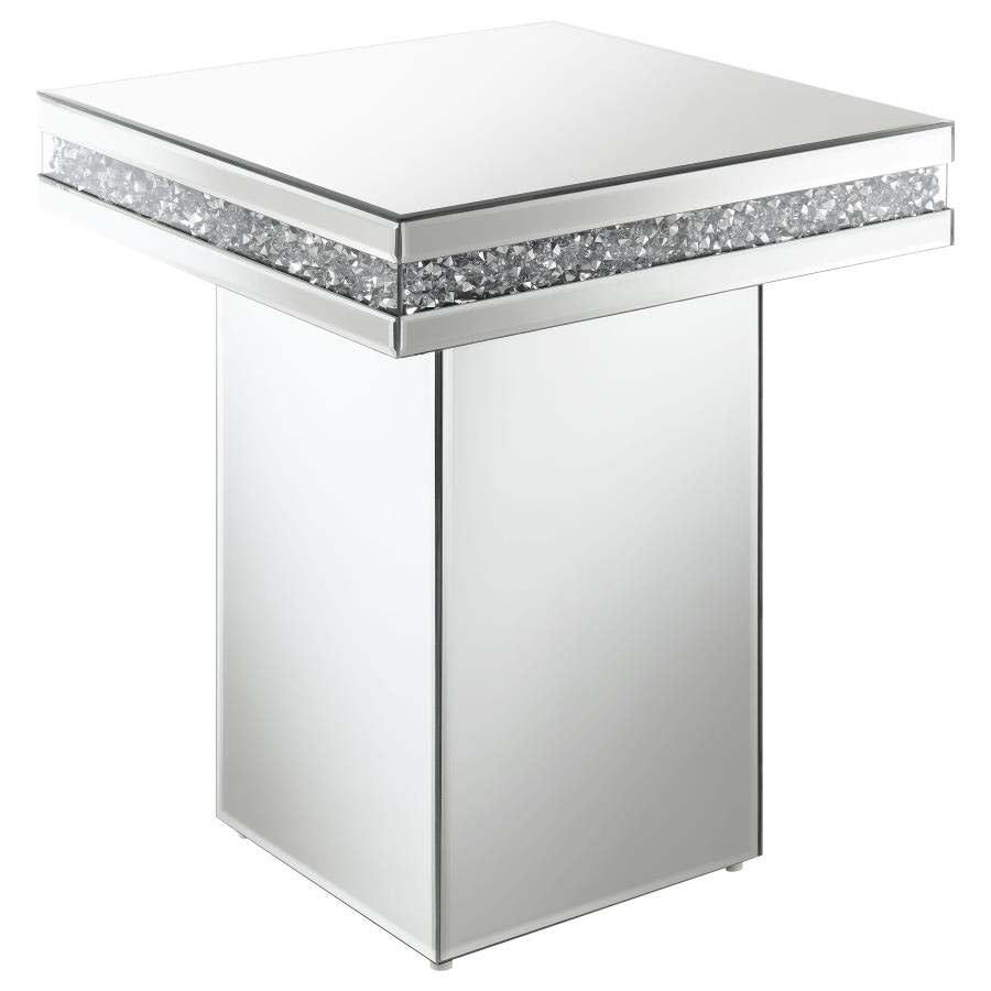 Showcase sculptures and décor on this stunning, modern glam accent table. A square table sits on a tall square pedestal for an edgy, bold expression. Smooth mirror trim and surfaces cover every edge, creating a sleek flair. Glittering acrylic crystals line the interior of a clear center band for an elevated luxurious touch. Small disguised feet offer a subtle elevation over rugs and floors and offer extra stability.