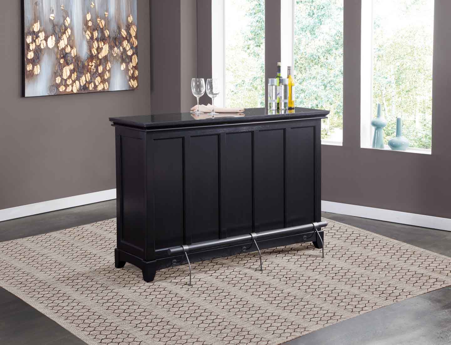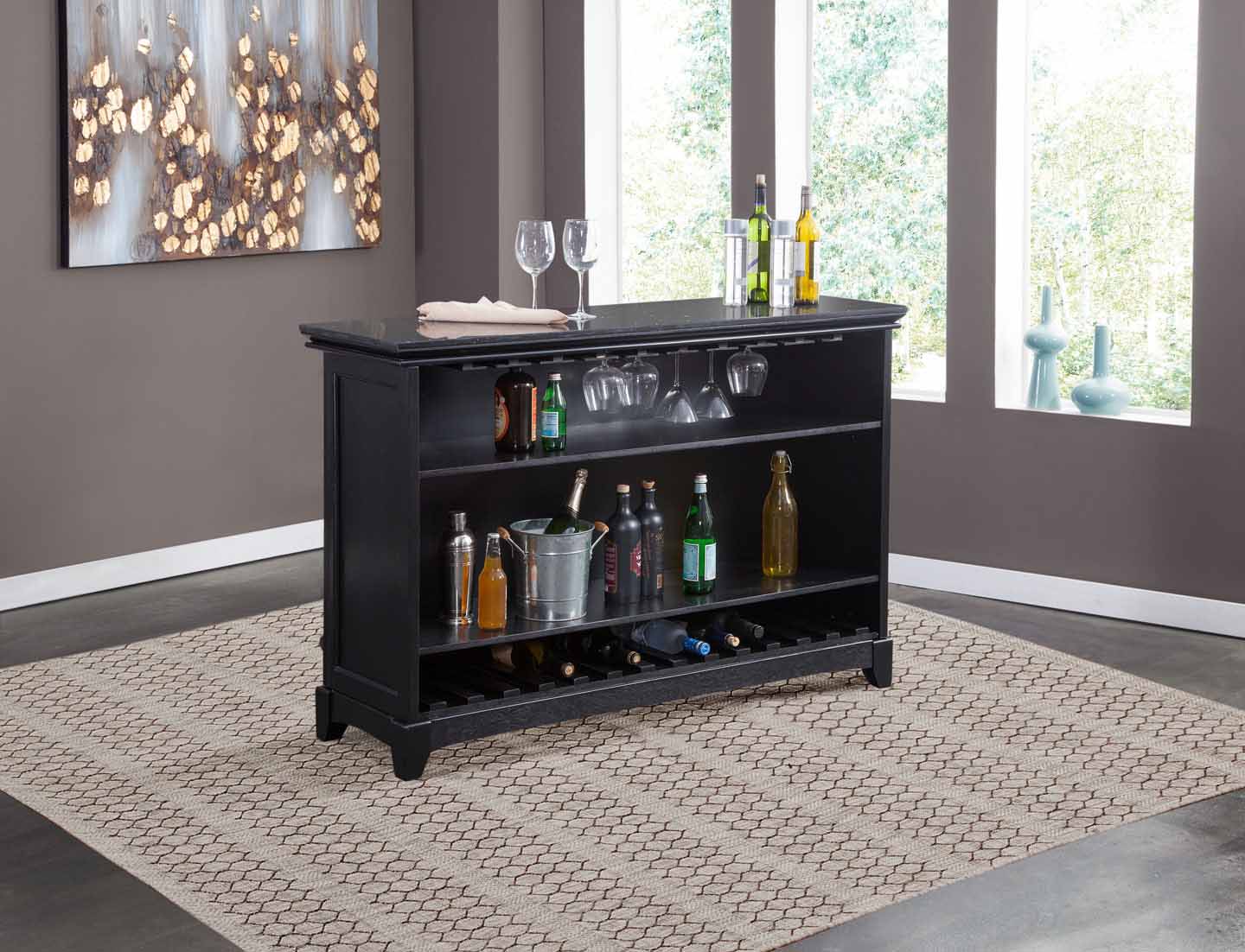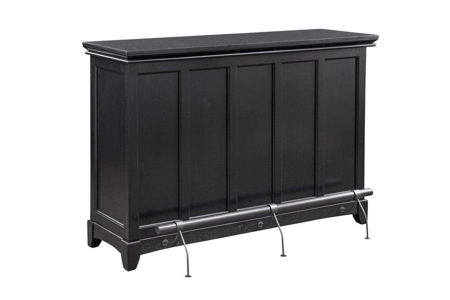 The Garcia bar will be the focal point of your entertaining space. The Garcia bar is constructed of hardwood solids and veneers in a ebony painted finish with a Silverstone composite top that resists scratches, moisture and heat. Storage is plentiful with space for both stemware and bottles. A front footrest is included and makes this a comfortable spot for friends to gather.
