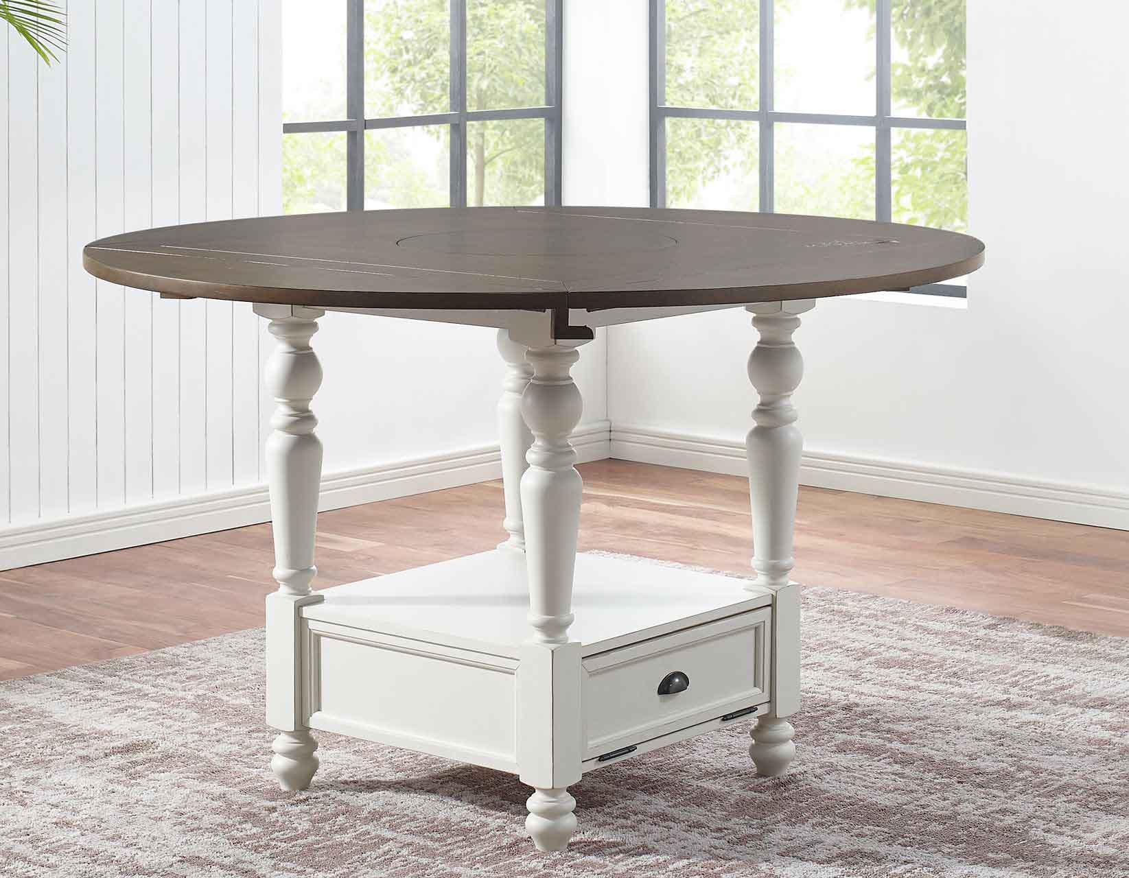 Gather ’round the Counter Height Dropleaf Table from the Joanna Collection. This 59 inch round table is packed with features the entire family will love starting with a double-drop leaf top that expands to seat up to eight. At the heart of the table-top is a lazy susan that makes serving dinner much easier! The turned leg counter base features a drop-down storage compartment for easy storage.