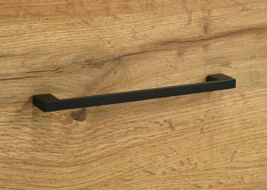 - Weathered brown and natural pine finish with matte black metal pull handles