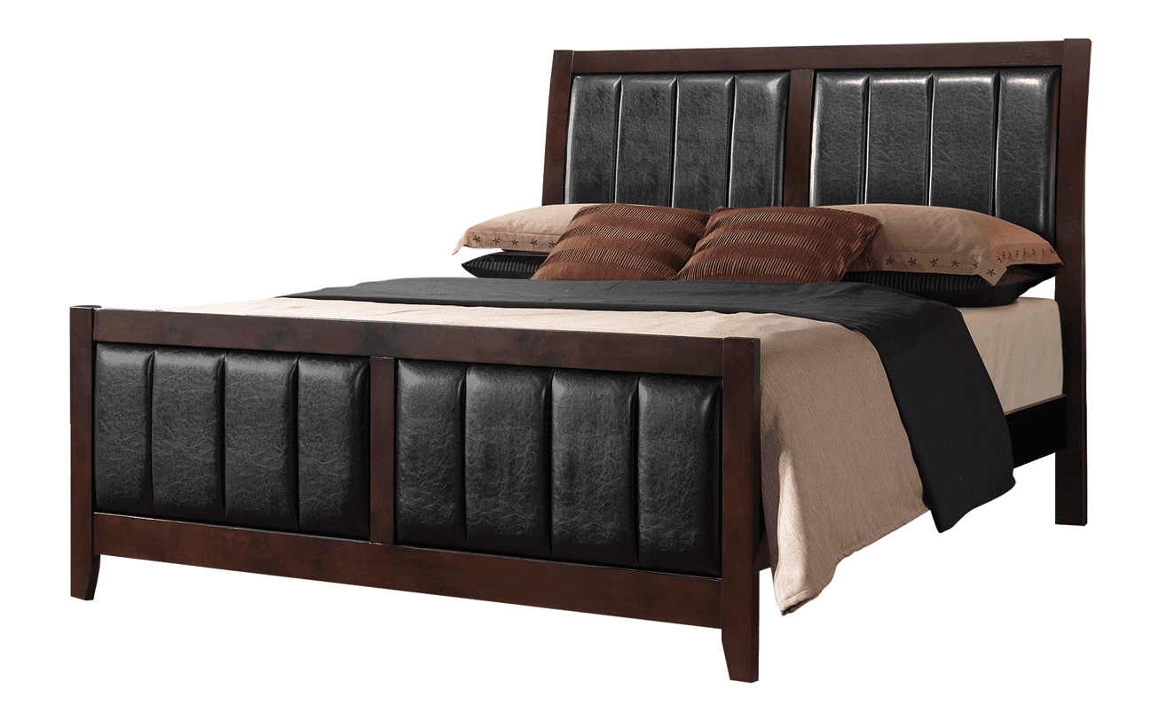 Bed features a black padded leatherette headboard and footboard