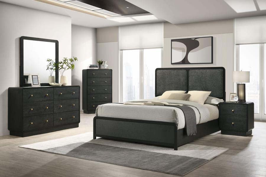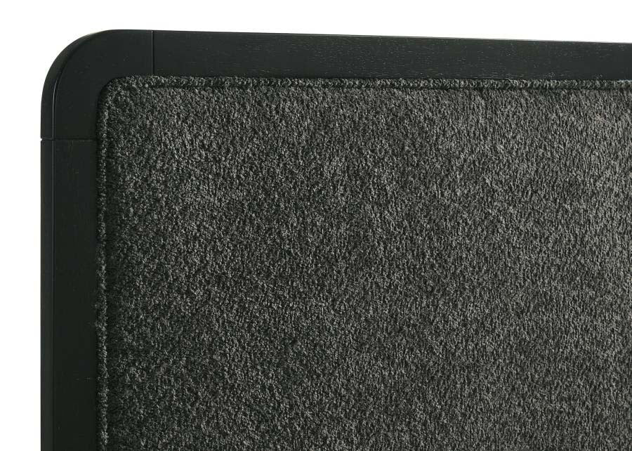 Tailored drama abounds in this modern bed with an upholstered headboard. Its crisp black finish pairs perfectly with charcoal fabric to create a deep, bold focal point for your bedroom. The bed boasts a tall headboard and low footboard, offering airy, open personality. Rounded corners complete the look, providing a softened effect for itsQUEEN overall silhouette. The bed is complete with levelers on its legs, allows for compensation for uneven flooring to ensure stability.