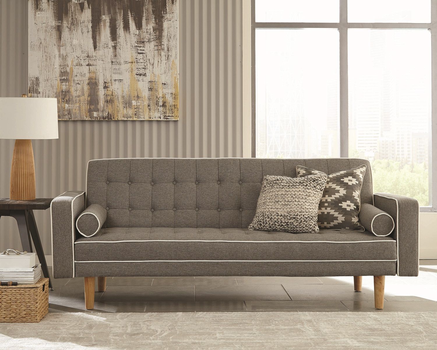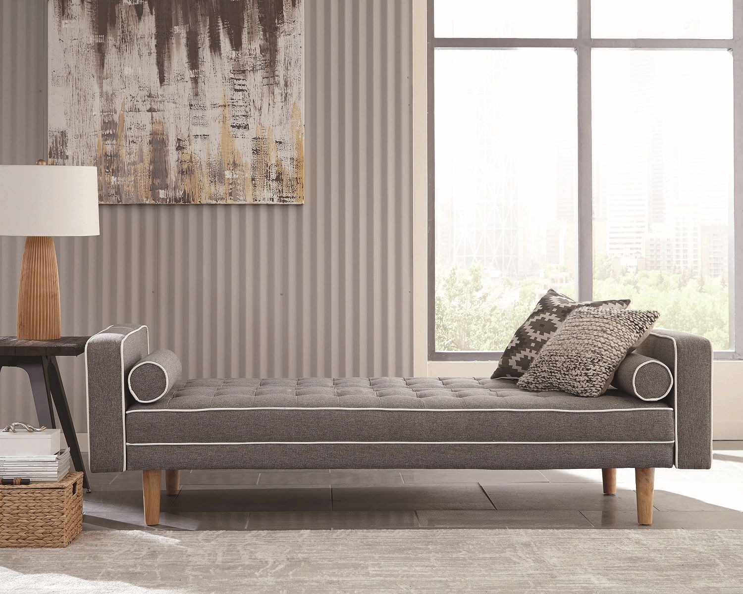 Upgrade a den or guest room with this chic, comfy sofa bed. Sinuous spring decking and high-density foam offer exquisite comfort. A kiln-dried hardwood frame and solid hardwood legs provide a sturdy foundation for hours of relaxation. With grey woven fabric upholstery enhanced by white piping and button tufting, it has a cool, casual look. This sofa bed comes complete with two bolster pillows for added comfort and support.