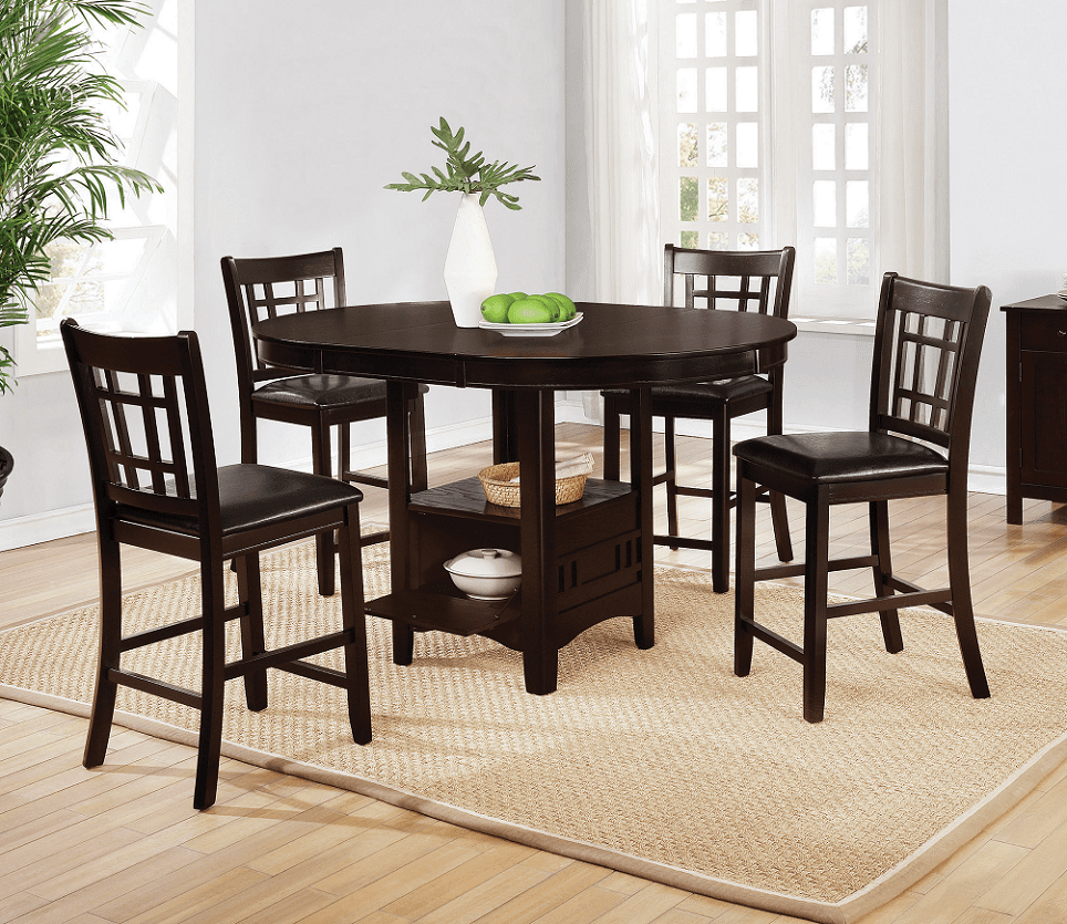 Stylish and sophisticated, this five-piece dining set is perfect for small spaces. Warm up a neutral room with the warmth of rich cappuccino hues. Fold down the leaf to welcome more family and friends. Store dinnerware in the built-in storage unit on the base of the counter height table to accommodate guests easily. The smooth legs of the table and four stools invite an open feel into a modern entertainment room.