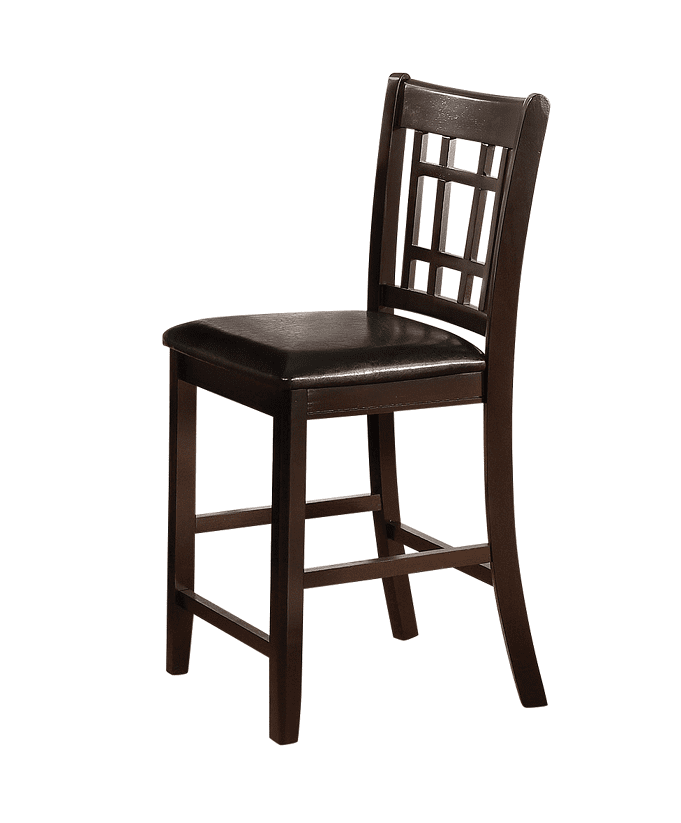 - Lattice back stools have upholstered seat cushions in black leatherette