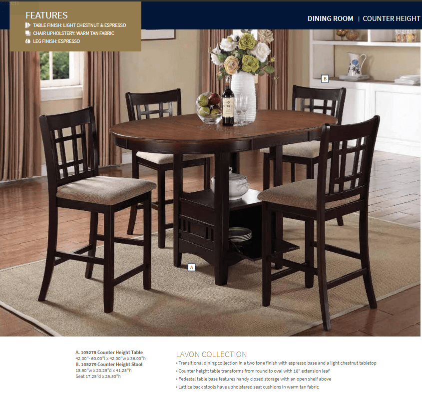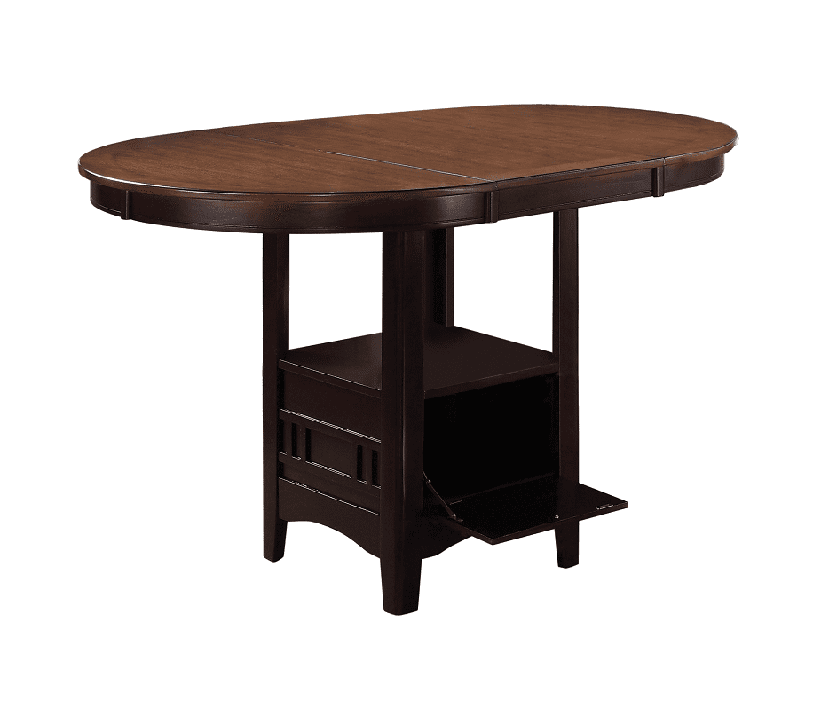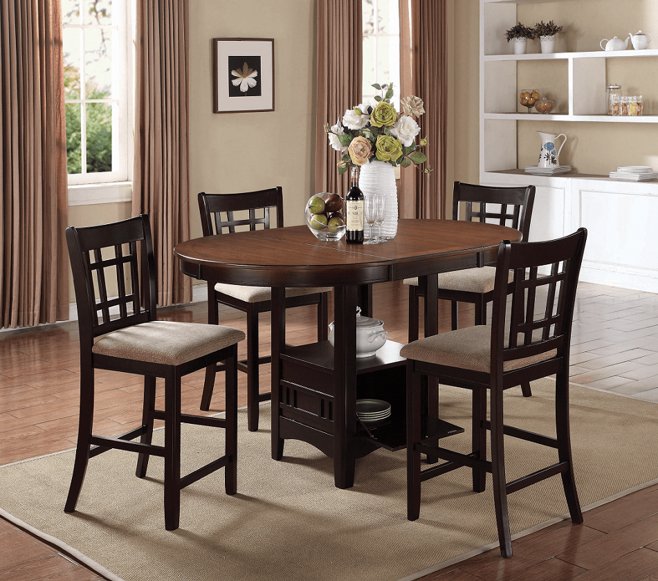 Create visual interest in a small space with this five-piece dining set. Light chestnut and espresso hues on the counter height table creates a warm two-tone effect. Welcome more family and friends with the built-in leaf. Store dinnerware in the built-in storage unit on the base of the counter height table to accommodate guests easily. The smooth legs of the table and four stools invite an open feel into a modern entertainment room.