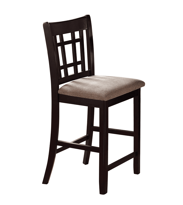 - Lattice back stools have upholstered seat cushions in warm tan fabric