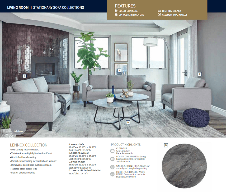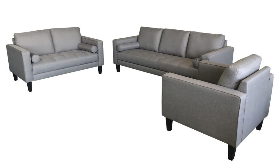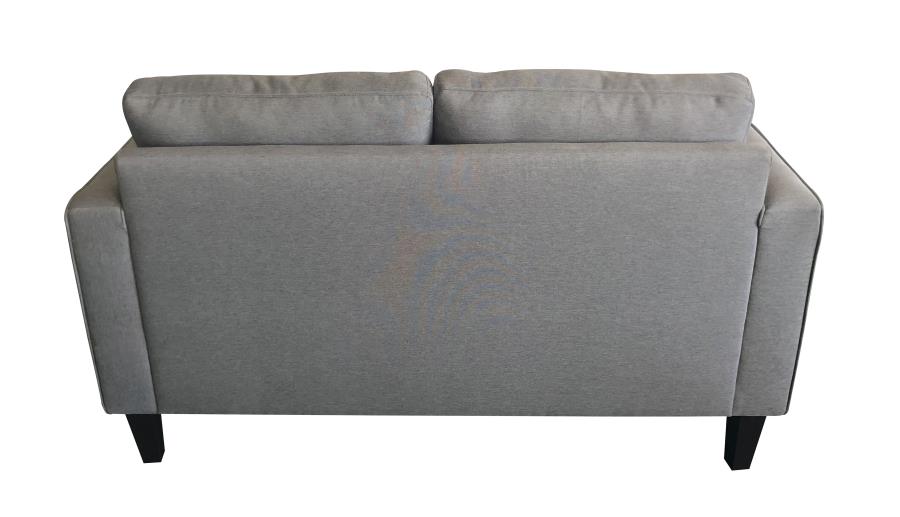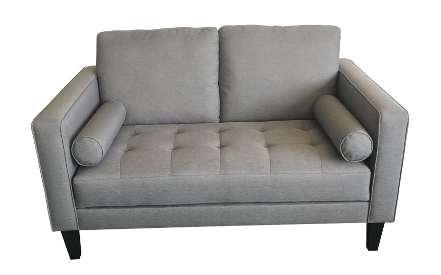 Brighten the look and feel of your home with this trendy Mid-Century Modern loveseat. The cool charcoal finish adds an elegant air that's well matched to most other décor. You'll love the coziness of the plush bench cushion with grid-like tufting. The thin track arms are each fashioned with self-welt details for visual appeal. Add in bolster pillows on each end, removable back pillows, and black tapered plastic legs and this enjoyable loveseat has a stylish design that everyone will love.