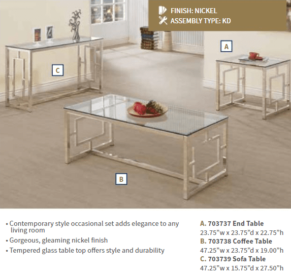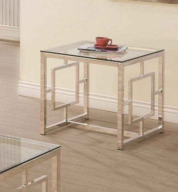 Dress up your décor with a dazzling touch of shine. This elegant end table features a stunning, shining nickel finish that beautifully reflects the light. Its top is crafted from durable tempered glass, creating a sturdy and versatile surface for drinks, snacks, or decorative accents. Its frame is fashioned into an intriguing, square-shaped silhouette, giving it an updated look. Whether placed by a sofa or on its own, this table adds a glamorous accent to any living space.