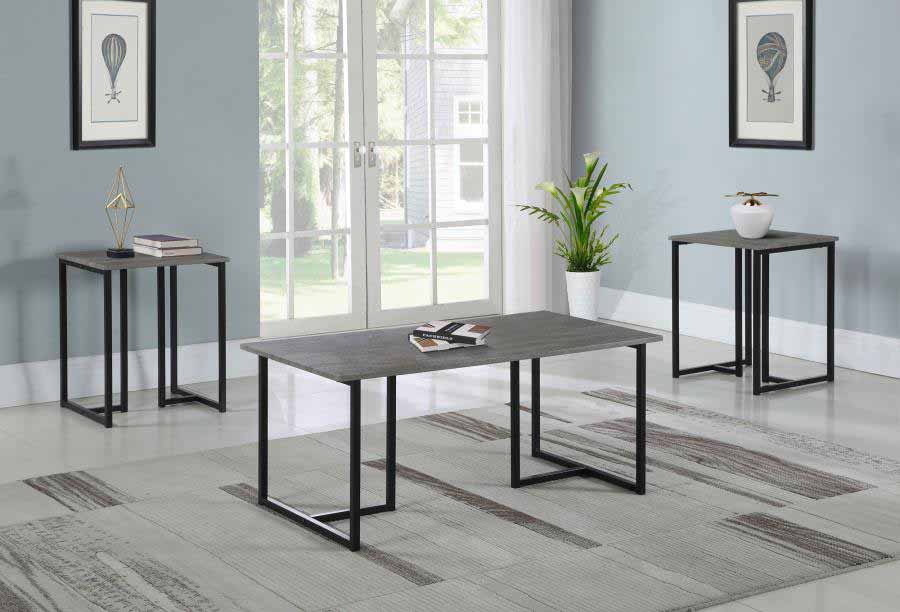 This three-piece table set was designed for both contemporary and transitional style living rooms. Complete with a coffee table and two end tables, each matching furniture piece offers a sleek, clean line silhouette. Elevated by a sleek metal base with a black powder coated finish, which also offers an open and airy look. Supported by the base is a smooth, weathered grey tabletop that lends a rustic-inspired, modern farmhouse look. Perfect for more compact rooms, add this set to a college dorm room or a studio apartment to lend a more minimal style.