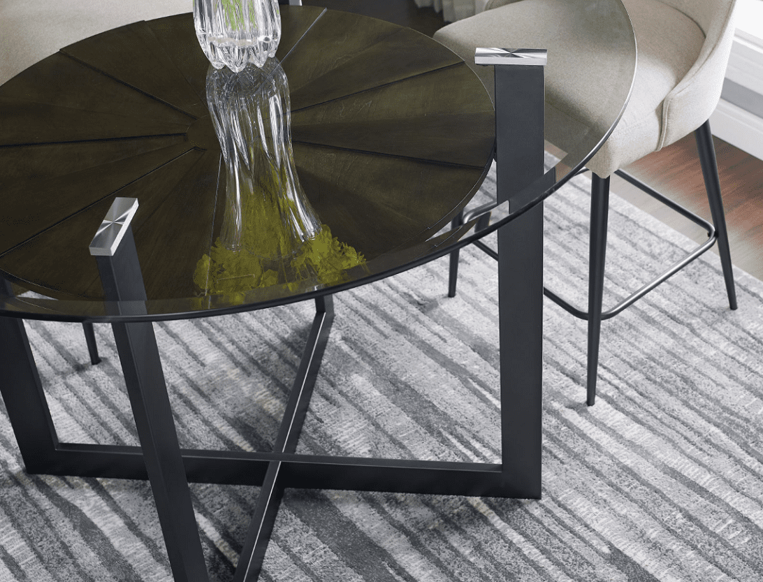 Perfect for small spaces, this counter height bar table set includes two bar stools. In a warm nut brown hue, the sleek lines are given texture. Featuring a slightly exposed wood grain, create a beautiful visual in any kitchen nook or transitional area. The bar stools feature an upholstered and plush seat made of black leatherette fabric. Sophisticated and elegant, the seats feature a stylish button tufting.