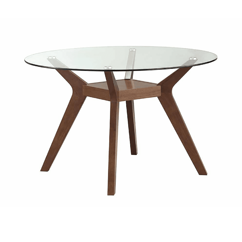 Gather for delectable meals and captivating conversations with the exquisite Paxton collection's contemporary dining table. The table stands gracefully on four angular legs, a captivating display of geometric elegance. Converging in a junction adorned with a square shelf, the legs exude architectural charm. Crowned by a 48" round clear tempered glass top, the table's surface is not only visually pleasing but also effortless to upkeep, seamlessly complementing diverse decors. The warm nutmeg wood finish adds an inviting touch, completing this stunning dining tableau with a flourish of sophistication and comfort.