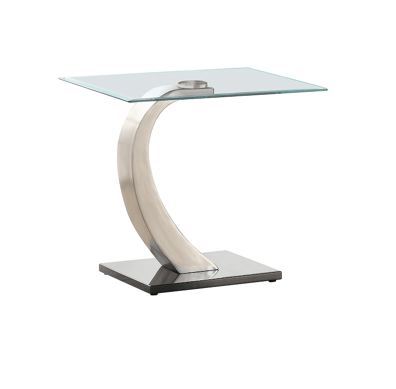 Reminiscent of a modern art museum, this end table boasts a stunning design. Its elegant, floating glass top is bolstered by a sturdy metal support with an eye-catching, curved silhouette. A high-sheen black base provides a stunning contrast to the smooth, large scaled satin finish of its support. Its artistic design infuses any room with contemporary glamour. This table looks especially gorgeous topped with a vase or art sculpture.
