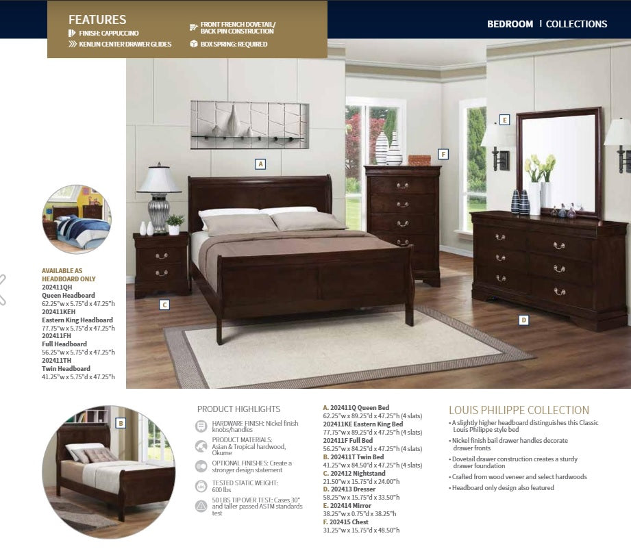 Marry modern and classic design with the rich hues and clean lines from this cappuccino queen bed. Showcasing classic Louis Philippe style, the headboard is slightly higher than the footboard. Geometric shapes constructed from wood veneer and select hardwoods make up the frame. With an exposed wood grain, the warm coloring creates a welcoming aura in a bedroom. Thin, delicate legs complete the sophisticated look.