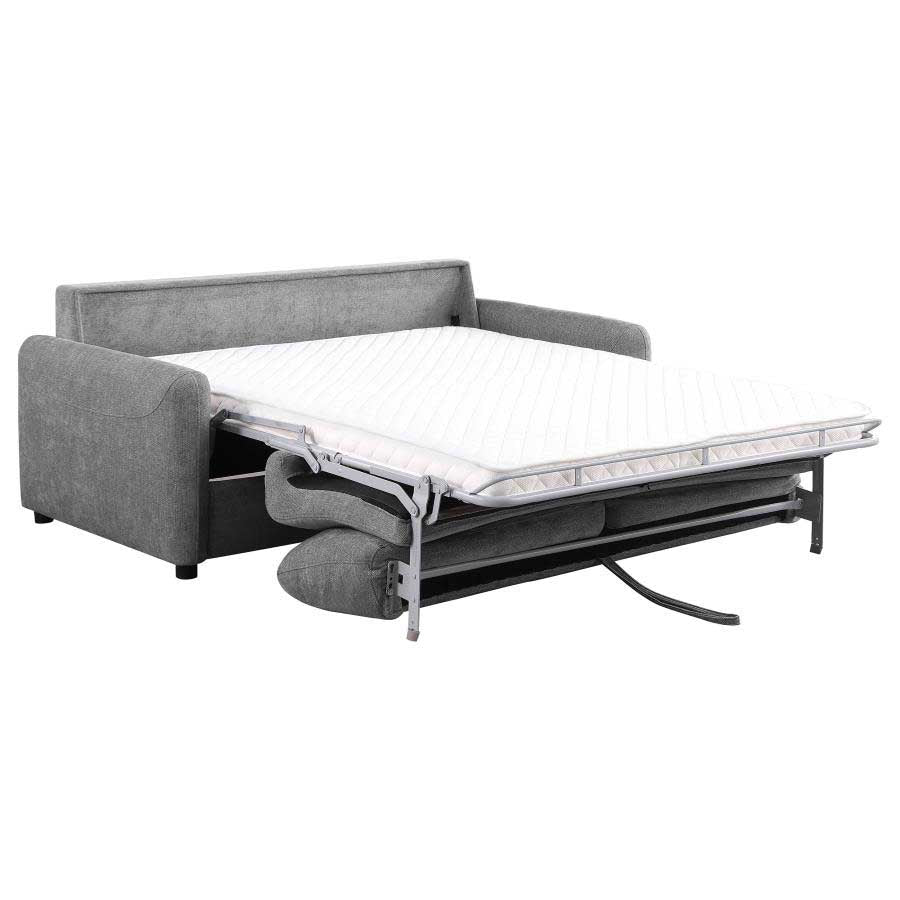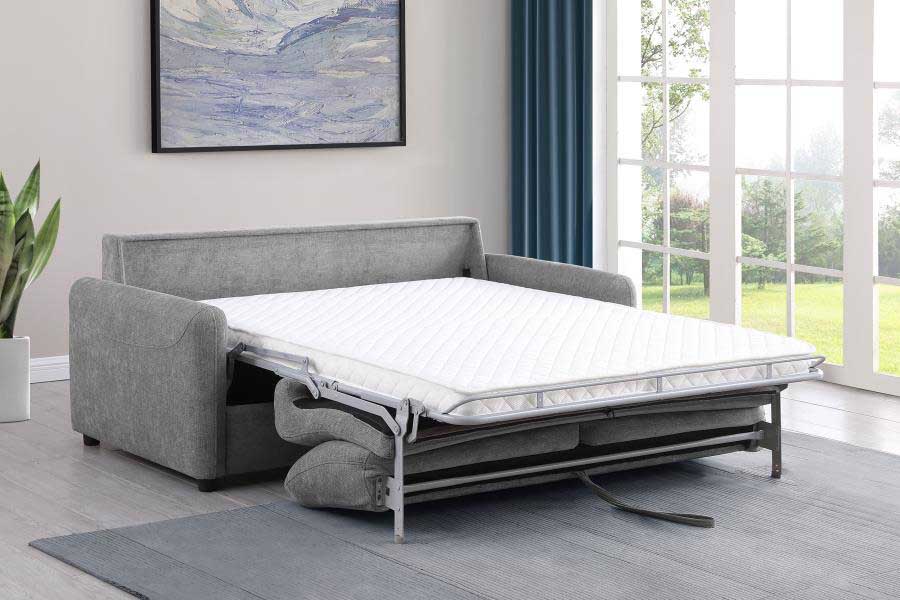 Spotlight stylish versatility with a modern sleeper sofa that adds functional seating to your living space. The convertible design offers clean lines and a minimalist profile, featuring slender rounded track arms and bench style seat cushions that will compliment your décor. This sofa is not only soft and inviting with its rich gray upholstery and foam and memory foam pad, but it also hides a convenient sleep space for overnight guests. With a simple pull of a handle located at the top backrest, it transforms into a sleep space with ease, extending to include a 3.75"H memory foam pad sleep surface. Perfect for compact living rooms or multifunctional home offices and dens, this sofa assures incredible comfort and support you'll be proud to offer friends and family.
