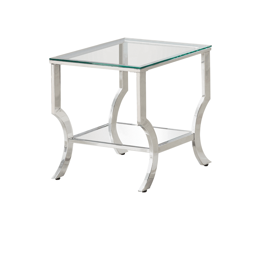 Radiate glamour through a chic living room with this stunning chrome end table. In a reflective finish, the interestingly angled legs and base give this table a delicate, hourglass-inspired feel. The square glass table top is great for opening up a space. Complete with one built-in mirrored storage shelf, the structured silhouette is stunning when paired with a juxtaposing cozy décor piece or in-theme French-inspired sculpture. Revel in the charming feminine qualities that add elegance to a variety of motifs.
