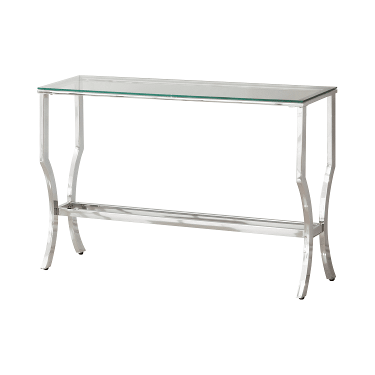 Extend a glamorous motif throughout an entryway with the charming radiance from this chrome sofa table. Elongated in silhouette, the rectangular glass top is great for adding an open and airy feel. The bright and reflective shine of metallic bliss gives this modern piece its chic personality. Delicately curved, the hourglass-inspired silhouette of the legs welcomes a feminine French-inspired feel. Add structure with the built-in storage shelf featuring mirrored details.