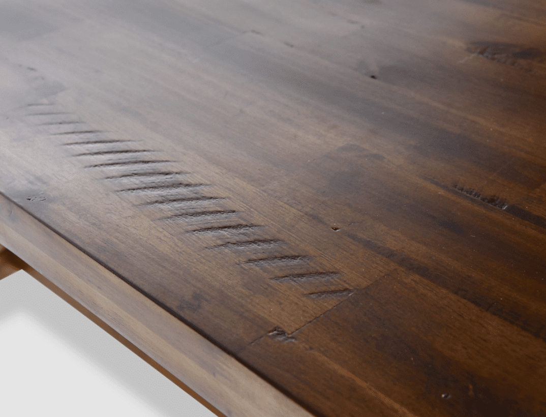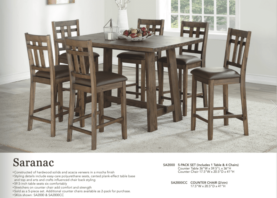 - Styling details include heavily distressed top, easy-care polyurethane seats, canted plank-effect table base, and top and arts and crafts influenced counter chair back styling