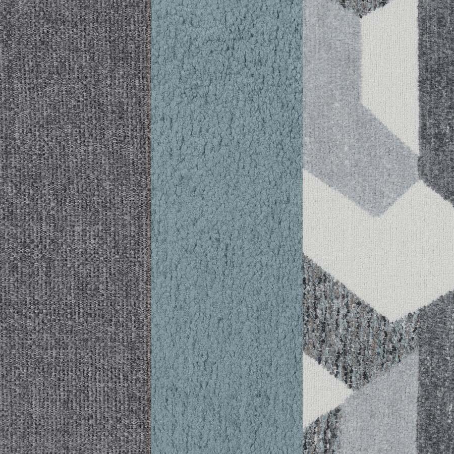 Four accent pillows with geometric patterns are included to complement neutral, modern upholstery