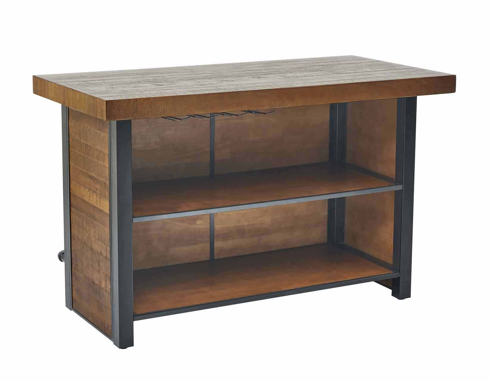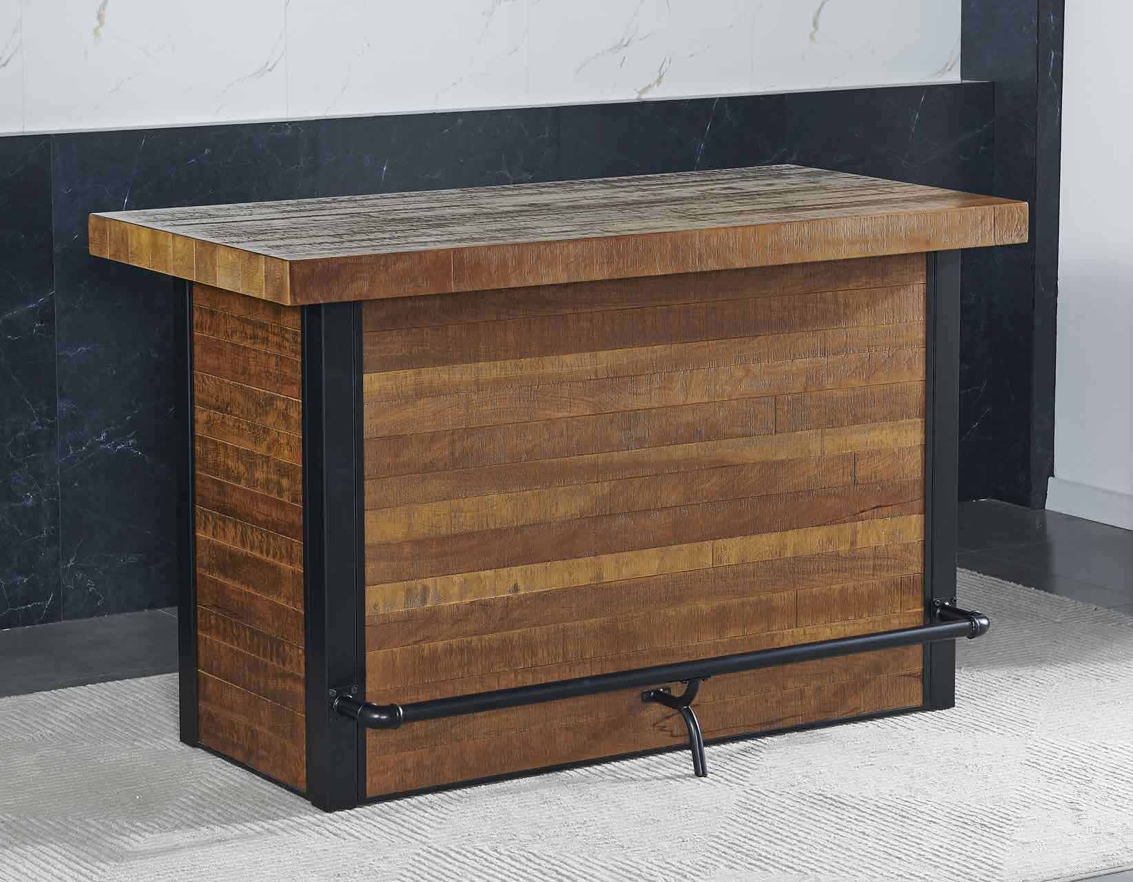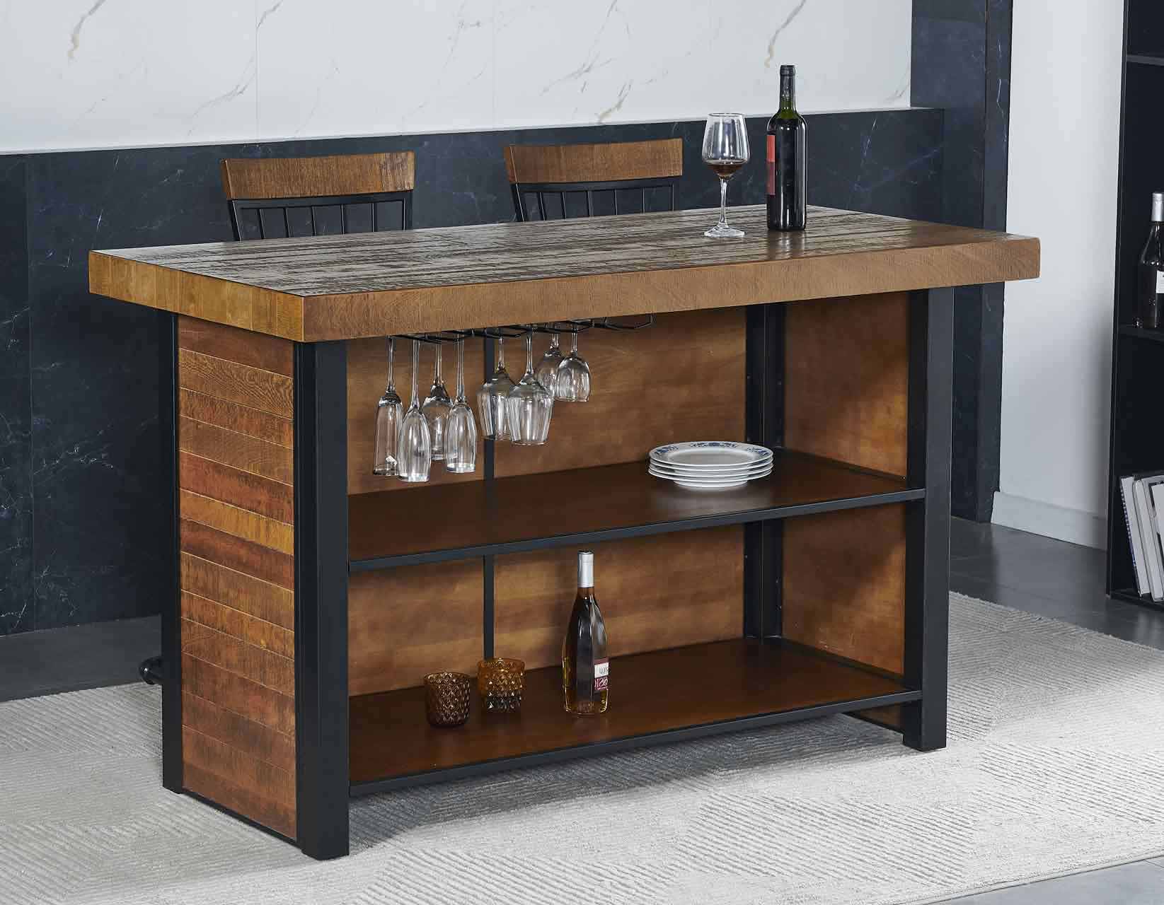 Sturdy and rustic, the Tyler 38-inch Bar Table offers a slice of nostalgia in a Bar setting. Casual and relaxed, Tyler has a great look with a warm Chestnut finish over a timber-beam base with powder-coated black accent and footrail. The back of the Bar offers everything needed for serving one or a crowd: a hanging stemware holder for storing glasses and a fixed shelf for ample room to store all the bottles needed. Organized and stylish, Tyler gives you both.