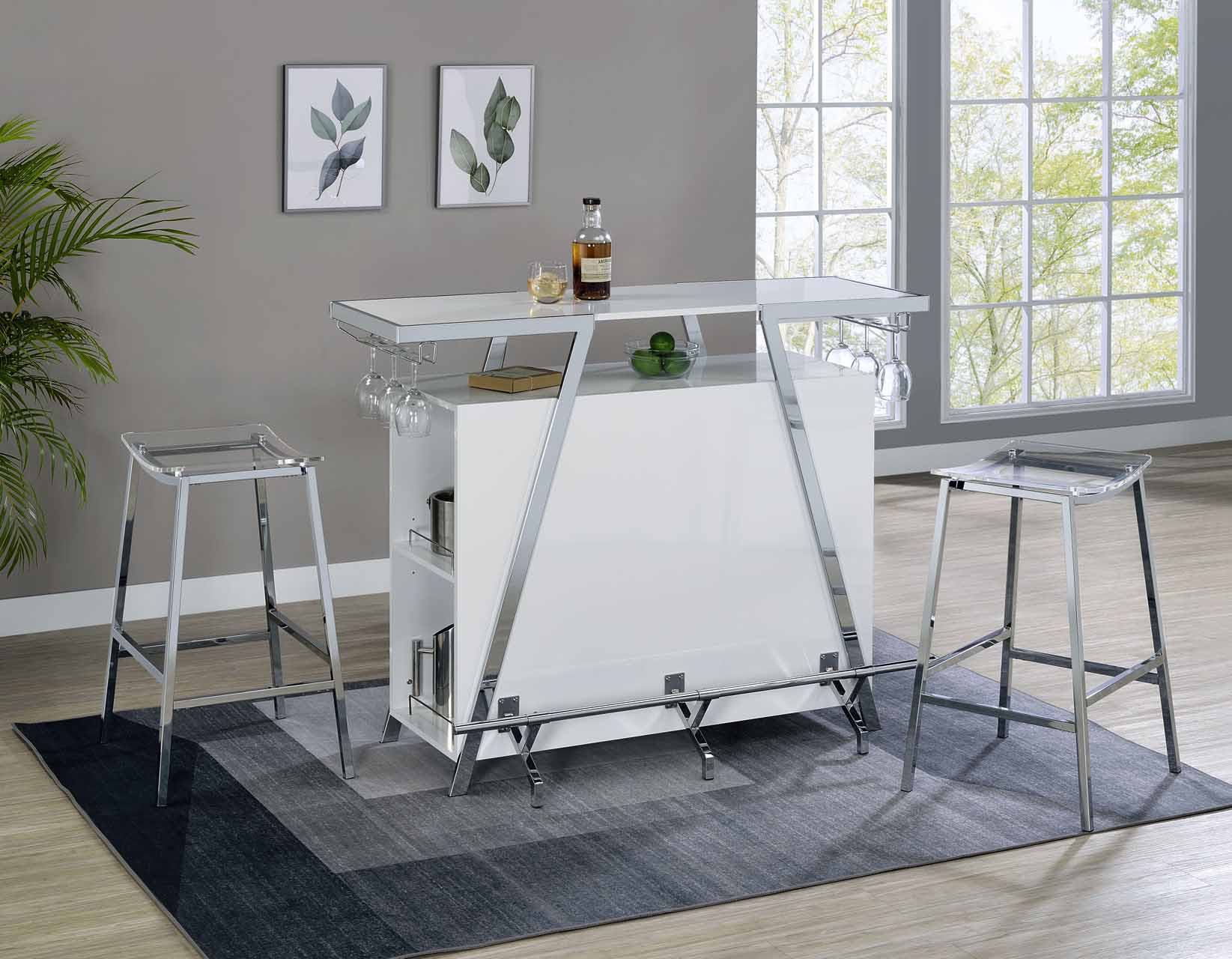 - White finished bar accented with chrome makes a modern statement in a bar set